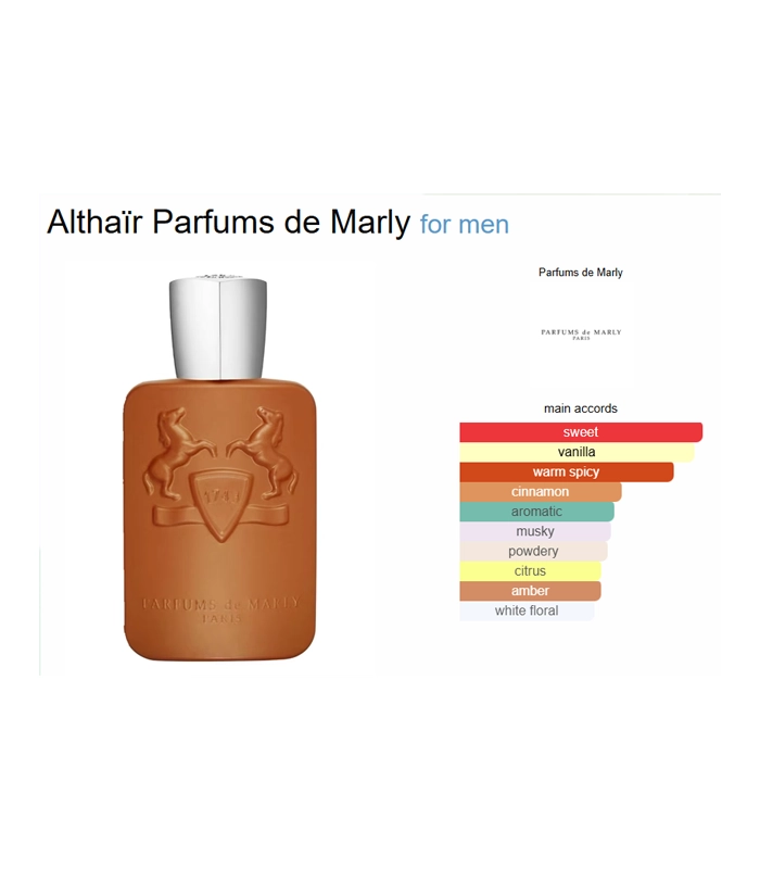 At its heart, Althaïr Parfums De Marly boasts a harmonious blend of rich, warm, and captivating notes. Drawing upon an intricate combination of amber, vanilla, and sandalwood, it provides a deep and sensuous experience that lingers beautifully. Enhanced by delicate floral touches and a subtle hint of spice, this fragrance creates an unforgettable aura that complements any occasion.