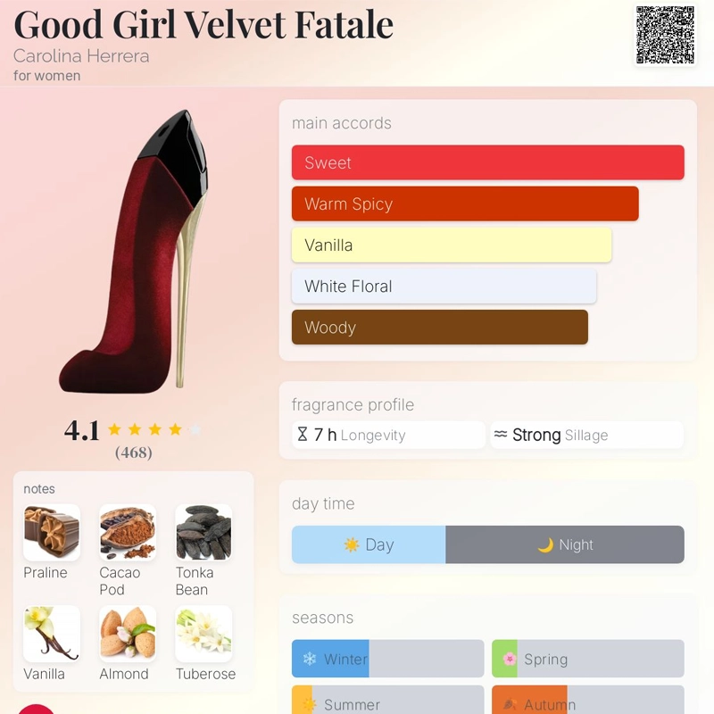 يحتفظ عطر فيلفيت فاتال بالتباينات الجريئة للحمض النووي لعطر جود جيرل الأصلي ولكنه يضخم الدفء والثراء للحصول على تأثير أكثر دراماتيكية. يفتتح العطر بالنفحات العليا المألوفة والمفعمة بالطاقة من اللوز والقهوة، مما يحدد نغمة واثقة وراقية على الفور. يحافظ القلب على الباقة الزهرية البيضاء الفخمة، التي تتميز بـ الياسمين سامباك ومسك الروم، والتي تتحدث عن الأناقة الأنثوية الخالدة. يتكشف المشهد الدرامي الحقيقي في القاعدة، حيث يتم تكثيف النفحات العميقة والجورماند من حبوب التونكا والكاكاو، مُغلفة بتوابل دافئة ومخملية تخلق نهاية مُغرية بشكل ساحق، وطويلة الأمد، ومخملية. يُعدّ هذا المزيج الشرقي الدافئ والمكثف العطر المثالي للحظات التي تتطلب أقصى قدر من التأثير، حيث يلتقي الرقي بالجاذبية الدرامية النقية.