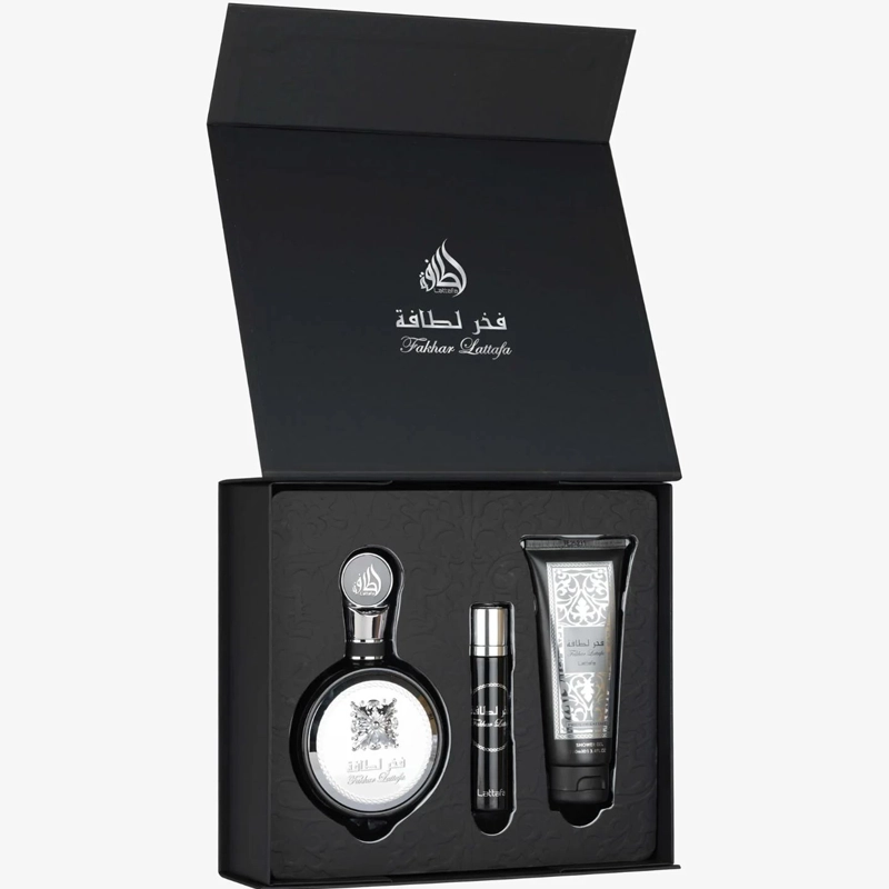 Fakhar Men is widely celebrated for its sophisticated “blue” fragrance profile. It opens with an invigorating blend of crisp apple, ginger, and bergamot, providing an immediate sense of clean energy. The heart introduces aromatic lavender and sage, which adds a refined, herbal depth. As it dries down, the fragrance settles into a warm, masculine base of tonka bean, cedarwood, and amberwood. This gift set provides a comprehensive grooming experience, ensuring that the invigorating and confident scent stays with you from the morning shower to the evening gala.