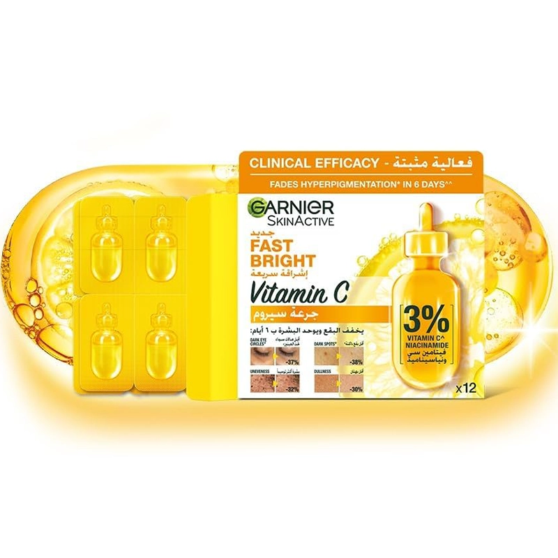 The Garnier Fast Bright Ampoule Serum is a potent, fast-acting treatment for hyperpigmentation and dull skin. This pack contains 12 ampoules of 1.5ml each, designed for a 6-day intensive treatment with two applications per day (morning and night).